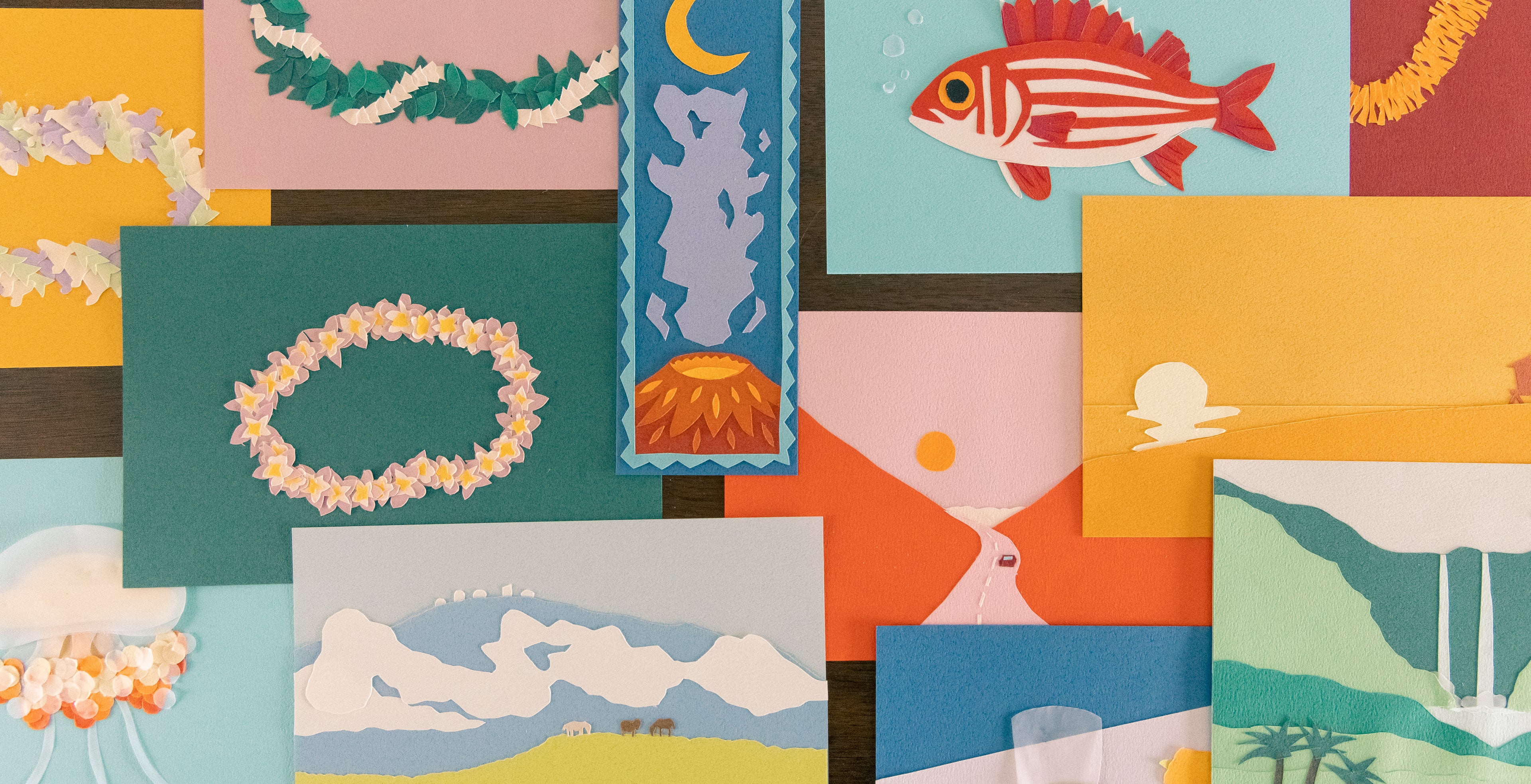 Each piece begins as a physical paper collage inspired by the shapes and colors of Hawai'i